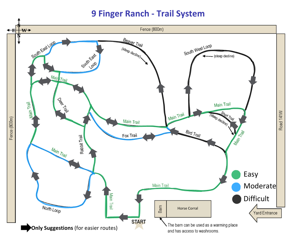 After turning onto our driveway, keep to the right and drive towards the barn. You can park directly at the trailhead. There is access to the barn as a warming facility and bathroom. Please self-register at the kiosk in front of the red barn.